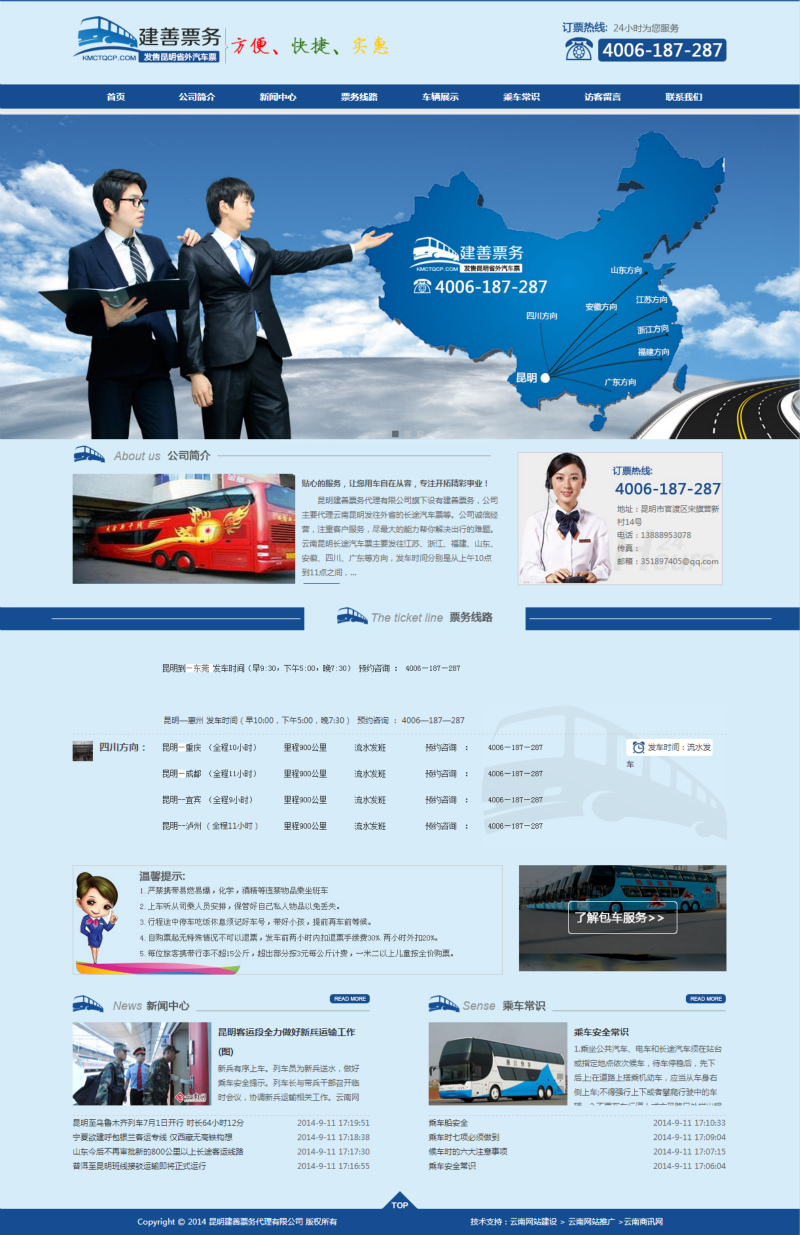 昆明建善票务代理有限公司旗下设有建善票务,公司主要代理云南昆明发往外省的长途汽车票等。公司诚信经营,注重客户服务,尽最大的能力帮你解决出行的难题。