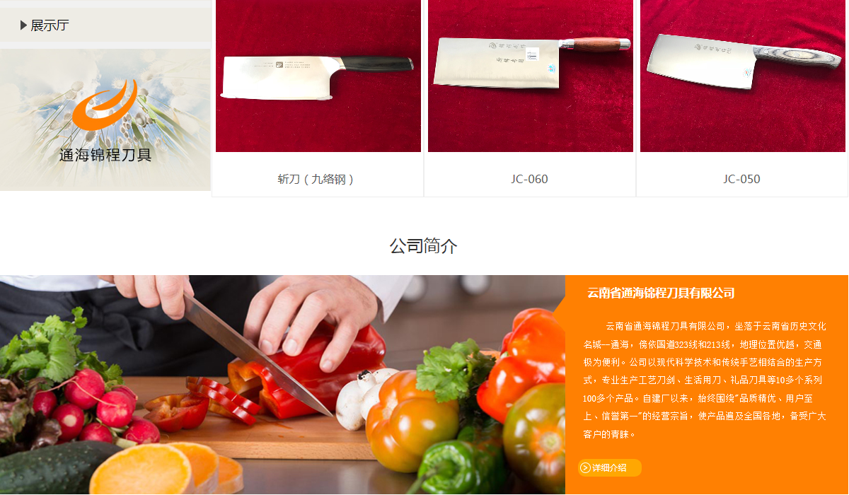 云南省通海锦程刀具有限公司,坐落于云南省历史文化名城--通海,傍依国道323线和213线,地理位置优越,交通极为便利。公司以现代科学技术和传统手艺相结合的生产方式,专业生产工艺刀剑、生活用刀、礼品刀具等10多个系列100多个产品。自建厂以来,始终围绕"品质精优、用户至上、信誉第一"的经营宗旨,使产品遍及全国各地,备受广大客户的青睐。