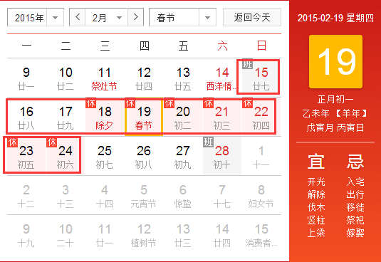 2015年春节放假安排:2月15日至2月24日放假调休,共10天。2月14日(周六)、3月1日(周日)上班(补班)。