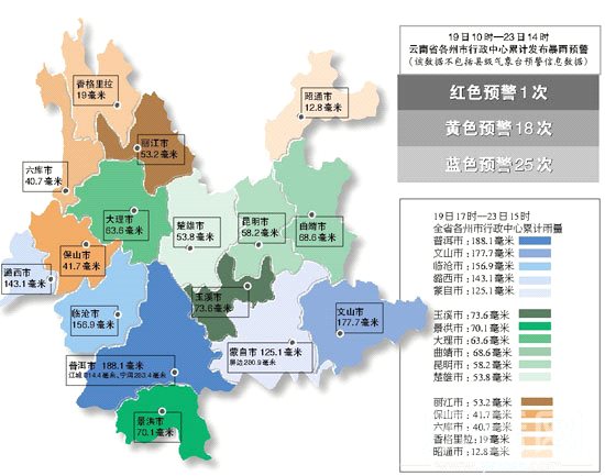 宁洱、江城、绿春、屏边、普洱和墨江成为降雨量最大地区,雨量分别为190.4毫米、182.7毫米、121.7毫米、108.7毫米、107.7毫米和105.5毫米。