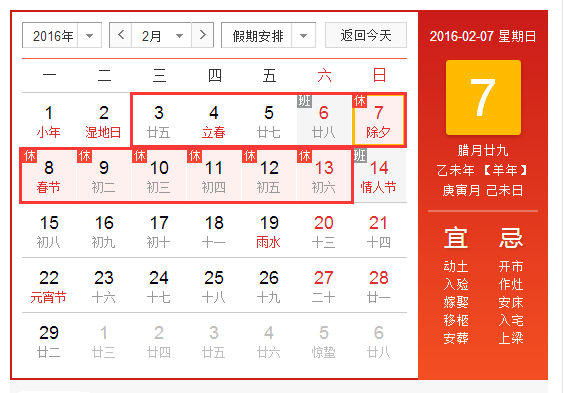 根据《国务院办公厅关于2016年春节放假安排的通知》,现将2016年春节放假日期安排通知如下: