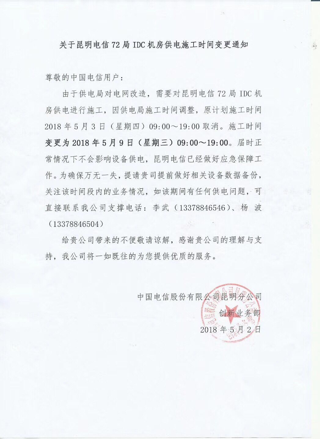 72电信机房供电施工通知