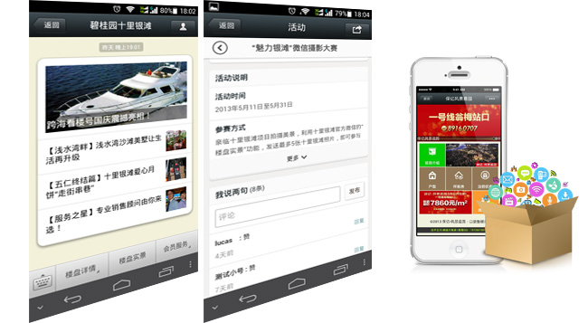 便民查询,增强客户粘性:城市天气、火车时刻、公交线路、实时翻译和百科常识等,各种便民查询,让你的楼盘公众帐号成为客户的伙伴。增加粉丝粘性,让粉丝无时无刻记挂你!